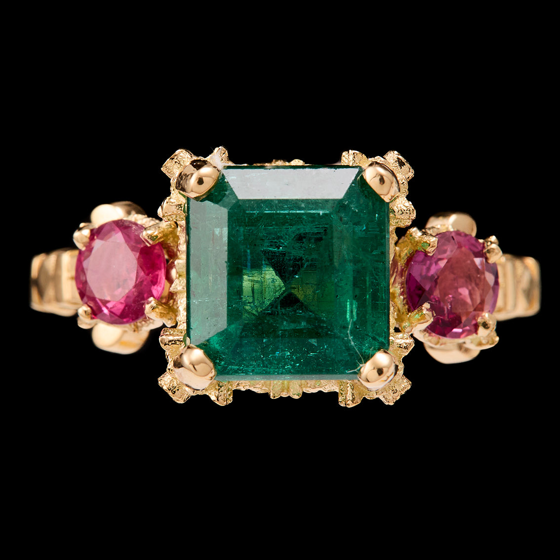 The Emerald Coquette Ring is an elegant creation. The stones are set with a floral festoon setting reminiscent of the neo-classical influences of the regency period. Each of the 4 claws holding the emerald in place is accented with a flowing ribbon bow embellished with a diamond. The emerald is contrasted by two luscious rubies. This sumptuous combination of contrasting coloured stones is enhanced by rich 18ct yellow gold. The intricate details and expert craftsmanship that go into each Metal Couture piece are evident in every aspect of this ring.